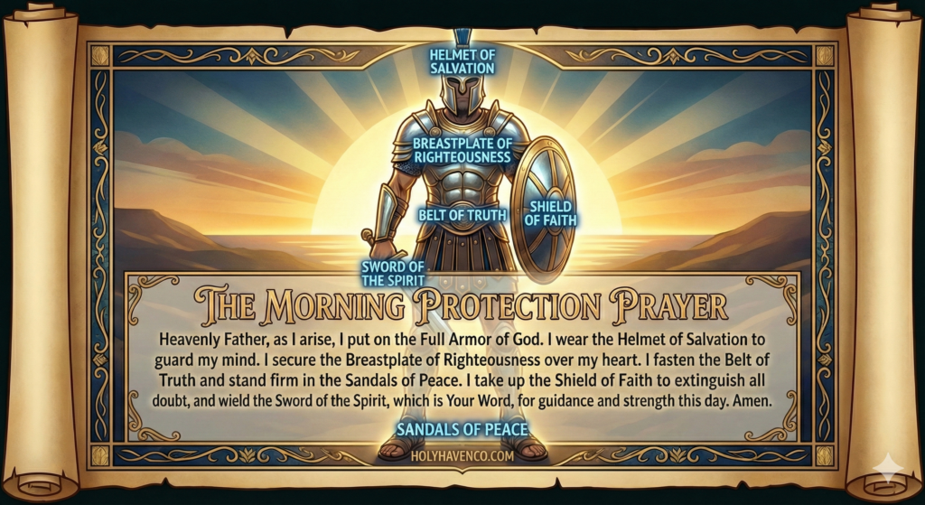 Morning Protection Prayer: “Heavenly Father, I cover myself with the blood of Jesus Christ. I put on the full armor of God and ask for Your angels to encamp around me. No weapon formed against me shall prosper. I declare that I walk under the shadow of the Almighty, protected and secure in You. In Jesus’ name, Amen.”